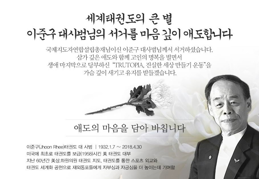 1일 국제지도자연합은 "이준구 사범이 미국 버지니아의 한 병원에서 급성 폐렴으로 세상을 떠났다"라고 고인의 타계 소식을 전했다.