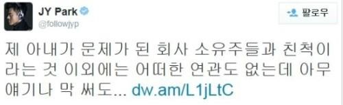 당시 박진영은 자신의 트위터에 "내 아내가 문제가 된 회사 소유주들과 친척이라는 것 이외에는 어떤 연관도 없는데 아무 얘기나 막 써도 되는 나라인가?"라며 "지난 몇 년간 많은 종교를 공부해봤으나 여전히 무교입니다"라고 해명했다.