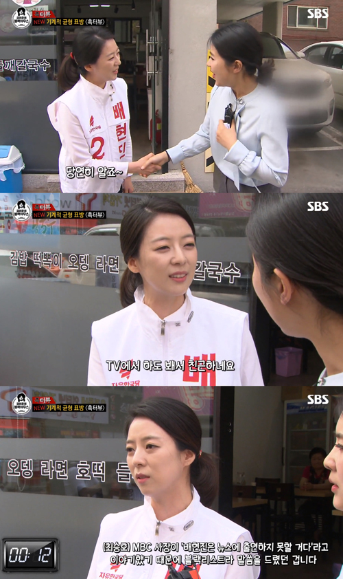 3일 방송된 SBS 시사교양 프로그램 '김어준의 블랙하우스'의 '강유미의 흑터뷰'에서는 강유미가 6.13 지방선거 송파을 지역을 찾아 배 후보를 만났다.