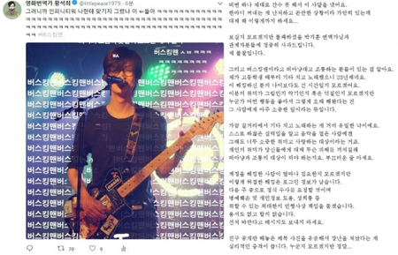 앞서 이날 황석희의 트위터에는 "그러니까 '어벤져스: 인피니티 워' 나한테 맞기지 그랬냐. 이 xx들아. #버스킹맨"이라는 내용의 글과 함께 기타를 치는 황석희의 배경에 '버스킹맨' 글자가 도배된 사진이 올라와 논란이 됐다.