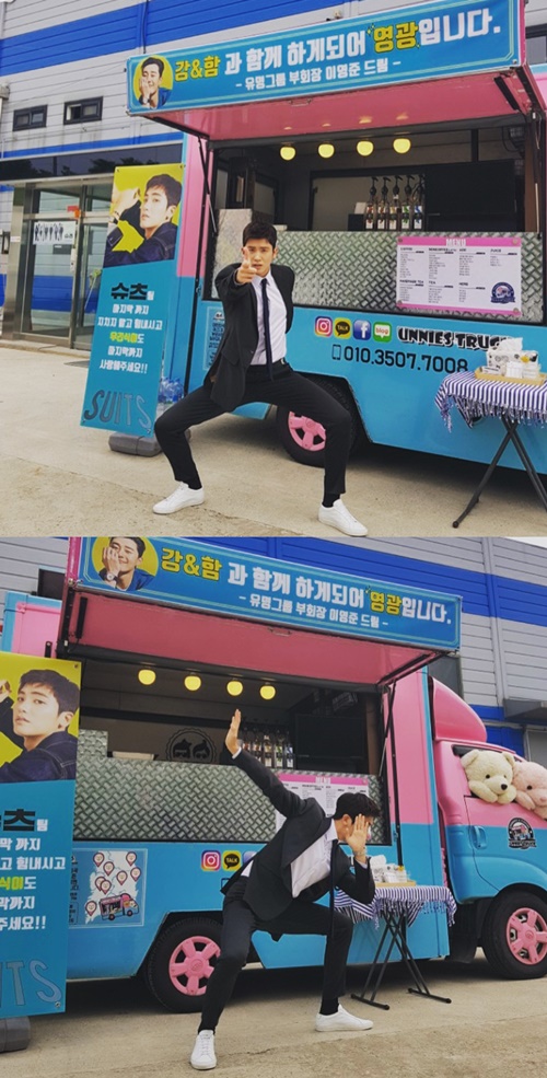공개된 사진 속 박형식은 박서준이 선물한 커피차 앞에서 귀여운 포즈들을 취하며 인증샷을 찍고 있다.