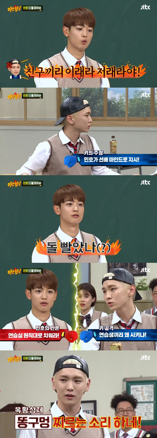 민호는 키를 언급하며 과거에 많이 싸웠다고 전했다. 민호는 "동갑이라 더 부딪혔다"면서 연습생 시절 일화를 공개했다. 먼저 연습생으로 들어온 민호는 키에게 청소 규칙을 알려줬지만, 키는 선배-후배 개념으로 지적받는 느낌이 들어 갈등이 생긴 것.