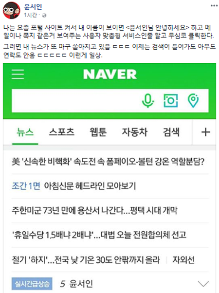 윤서인은 21일 자신의 페이스북을 통해 "나는 요즘 포털 사이트 켜서 내 이름이 보이면 '윤서인님 안녕하세요'하고 메일이나 쪽지 같은거 보여주는 사용자 맞춤형 서비스인줄 알고 무심코 클릭한다. 그러면 내 뉴스가 또 마구 쏟아지고 있음. 이제는 검색어 들어가도 아무도 연락도 안옴. 이런 게 일상"이라는 내용의 글과 함께 포털 사이트 캡처 사진을 올렸다.