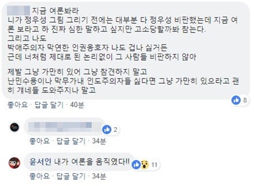 이에 한 네티즌은 "제대로 된 논리 없이 그 사람들 비판하지 않는다. 가만히 있어라. 참견하지 말라"라고 윤서인의 게시물에 댓글을 달았다. 그러자 윤서인은 "내가 여론을 움직였다!"라고 답글을 달며 응수했다.