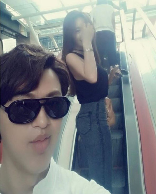 공개된 사진 속 유상무는 에스컬레이터에서 강예빈과 함께 카메라를 응시하는 포즈를 취하고 있다. UFC 옥타곤 걸로도 유명한 강예빈은 잘록한 허리와 인형 같은 미모를 자랑했다.
