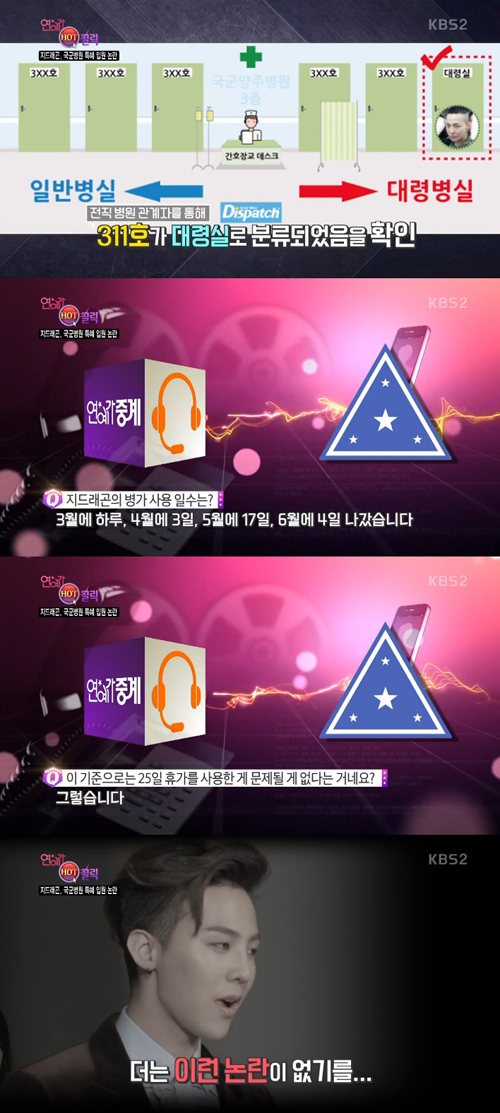 '연예가중계' 측은 육군본부 정훈공보실 관계자에게 지드래곤 논란 쟁점에 대해 문의했다. 관계자는 "지드래곤이 3월에 하루, 4월에 3일, 5월에 17일, 6월에 4일 나갔다"고 밝히면서 "병가는 1년에 최대 30일 이내에서 사용할 수 있다"고 전했다. "이 기준으로 25일 휴가를 사용한 게 문제 될 게 없느냐"는 질문에 "그렇다"고 대답했다.