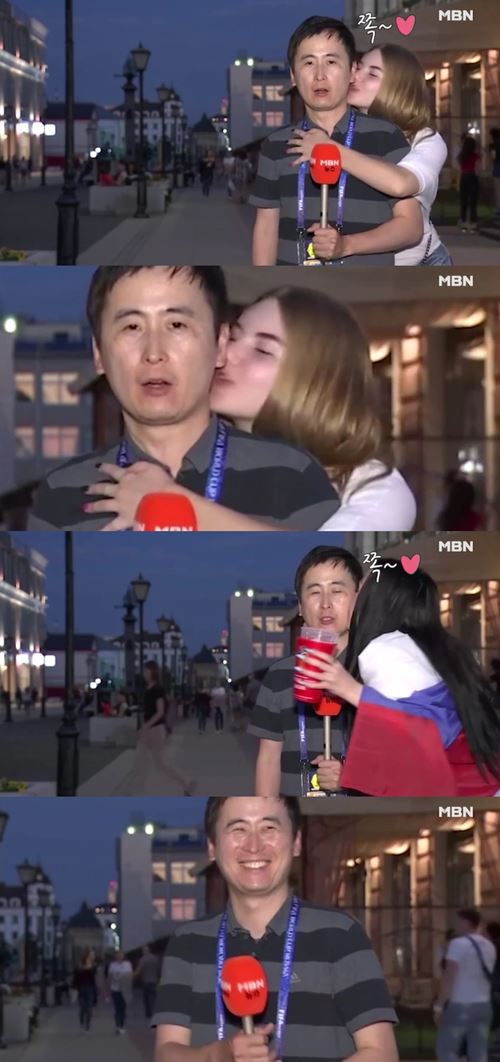 이날 MBN 기자는 러시아 현지에서 생중계로 2018 러시아월드컵의 열기를 전하고 있었다. 그러던 중 느닷없이 러시아 여성 두 명이 다가와 그에게 뽀뽀를 퍼부었다.