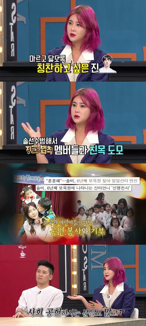 이어 그는 과거 사회 공헌대상에서 상을 받기 민망해 도망간 사연도 밝혔다. 그는 "사회 공헌을 하시는 분도 많은데 내가 받는 게 너무 부끄러웠다"며 당시 심경을 털어놓는다. 솔비는 봉사활동, 자선 콘서트 참여, 수익금 전액을 기부하는 전시회를 기획하는 등 소외된 이웃에게 사랑과 관심을 전하는 활동을 이어가고 있다.