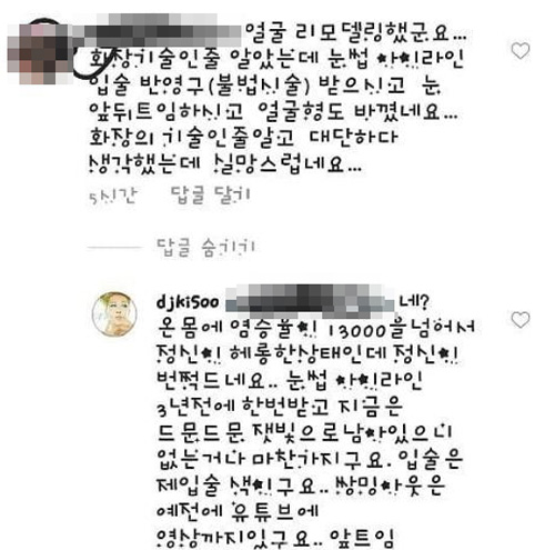해당 캡처 속 한 네티즌은 김기수에게 "얼굴 리모델링 했군요. 화장 기술인 줄 알았는데 눈썹 아이라인, 입술 반영구(불법 시술) 받응시고 눈 앞, 뒤트임 하시고 얼굴형도 바뀌었네요. 화장의 기술인 줄 알고 대단하다 생각했는데 실망스럽네요"라고 적었다.
