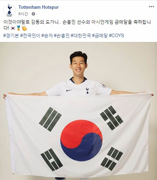 토트넘은 지난 1일 공식 페이스북을 통해 한글로 "이것이야말로 감동의 도가니. 손흥민의 아시안게임 금메달을 축하합니다"라는 내용의 글을 게재했다. 이 계정은 평소 영문으로 운영되지만, 이날만큼은 한글로 축하 메시지를 올렸다.