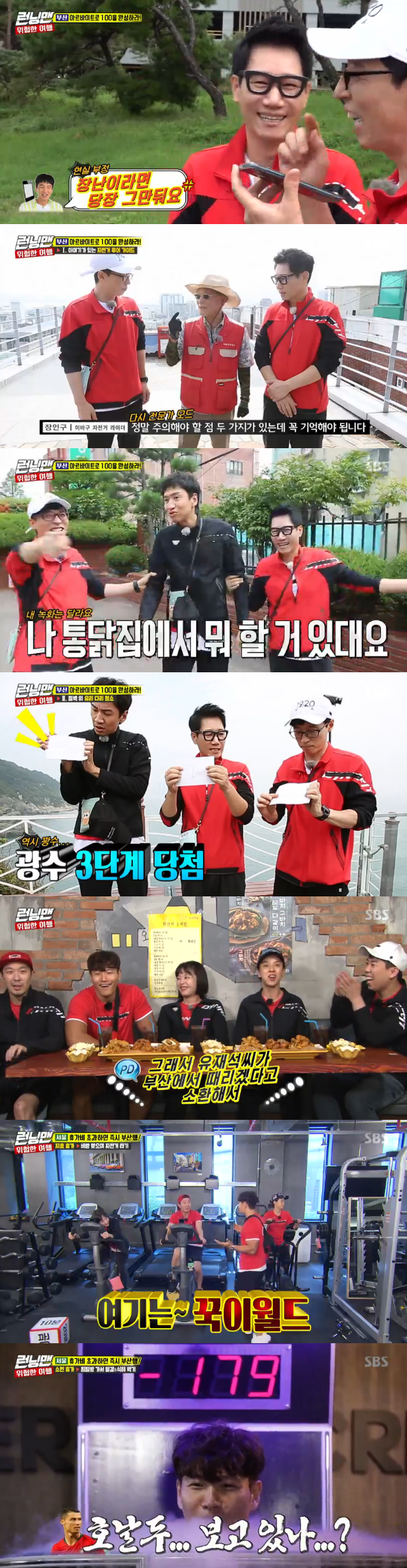 이날 유재석과 지석진은 벌칙 여행을 떠나기 위해 공항에 도착했다. 목적지는 부산. 미션은 아르바이트였다. 유재석은 "지석진과는 힘들다. 한 명이 더 필요하다"라고 불평했다. 이어 그는 "이광수가 저번 녹화때 이마 맞기를 두 대 빚졌다. 이광수를 부르겠다"라고 선언했다.