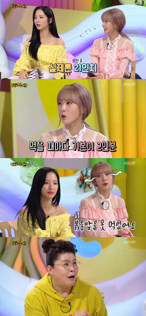 우주소녀 보나와 루다는 말도 안되는 고민으로 먹신 이영자를 자극했다. 바로 "먹어도 먹어도 살이 안 찐다"는 것. 더군다나 두 사람 모두 한 끼에 2인분씩 먹는다고 밝혔지만 허리가 21인치라고 말해 놀라움과 부러움을 동시에 선사했다.