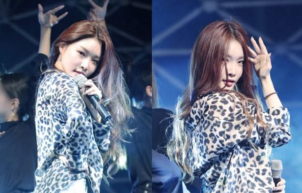 공개된 영상 속 청하는 호피무늬 셔츠에 짧은 핫팬츠를 입고 무대에 올랐다.