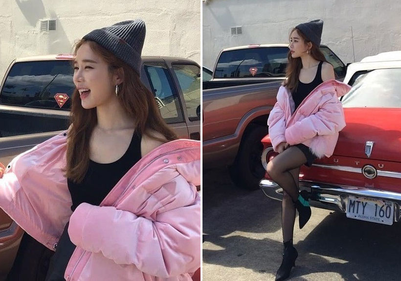 공개된 사진 속 유인나는 민소매 의상에 스타킹을 신고 자동차에 살짝 기댄 채 포즈를 취하고 있다.