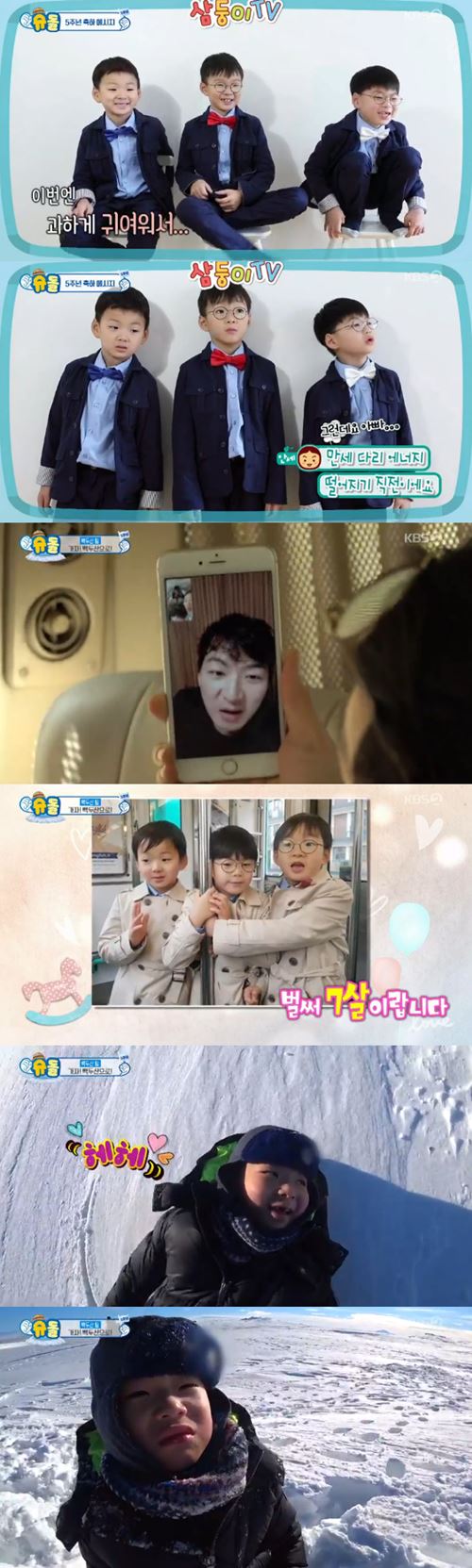 감성이 가득한 민국이는 눈 위에 누운 채 팔과 다리를 움직이는가 하면, 만세는 더 놀고 싶다며 울상을 지어 폭소를 유발했다. '아버지 바라기' 대한이는 송일국의 뒤를 쫓아다니며 깊은 애정을 드러냈다. 어느덧 씩씩한 어린이로 훌쩍 자란 대한, 민국, 만세의 밝고 건강한 소식은 시청자들의 흐뭇함을 고조시켰다.