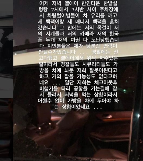 그러면서 차량 안에 소지품을 둘 수 밖에 없던 상황도 설명했다. 그는 "일단 우리는 체크아웃 후 비행기를 타러 공항을 가는 길에 잠시 들려서 저녁을 먹는 상황이라서 어쩔 수 없이 가방을 차에 둬야 하는 상황이었다"고 설명했다.