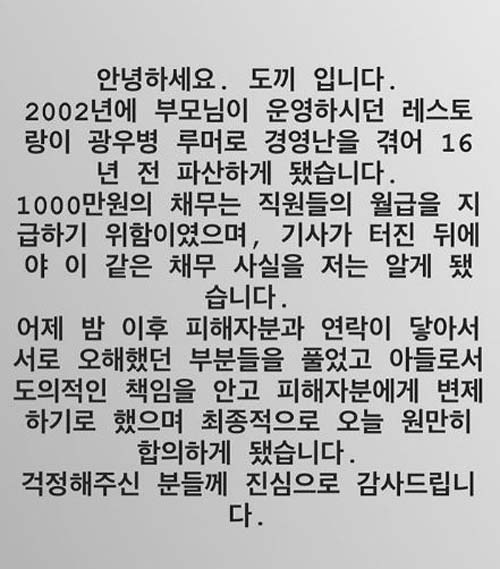 27일 도끼는 자신의 인스타그램에 "2002년에 부모님이 운영하시던 레스토랑이 광우병 루머로 경영난을 겪어 16년 전 파산하게 됐다. 1000만 원의 채무는 직원들의 월급을 지급하기 위함이었으며, 기사가 터진 뒤에야 이 같은 채무 사실을 저는 알게 됐다"고 설명했다. 또 "어젯밤 이후 피해자 분과 연락이 닿아서 서로 오해했던 부분들을 풀었고 아들로서 도의적인 책임을 안고 피해자분에게 변제하기로 했으며 최종적으로 오늘 원만히 합의했다"고 알렸다.