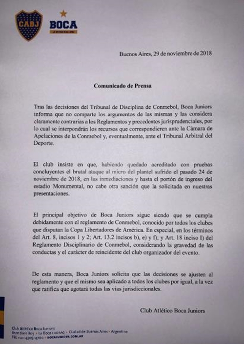 30일(이하 한국시간) 보카 주니어스는 공식 홈페이지를 통해 "국제스포츠중재재판소(TAS)에 제소했다"고 밝혔다. 보카 주니어스는 이날 공식 사회관계망서비스(SNS) 계정을 통해 이와 관련한 문서를 공개했다.