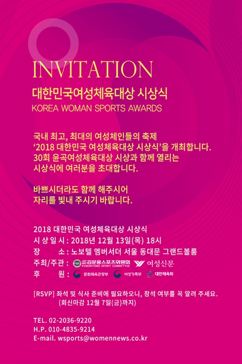 올해 여성체육대상은 공모 기간(10.8~11.9일) 내 접수한 여성스포츠인을 대상으로 선정위원회를 열어 각 분야를 선정했다. 시상식은 12월 13일 오후 6시 노보텔 앰배서더 서울 동대문(B1 그랜드볼룸)에서 개최된다. 대한민국 여성체육대상은 김운용스포츠위원회와 여성신문이 공동 주최한다.
