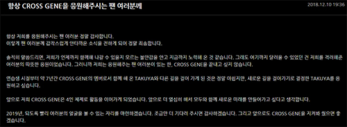 이어 "다른 길을 걸어가게 된 것은 정말 아쉽지만 새로운 길을 걸어가기로 결정한 타쿠야를 응원하고 싶다. 앞으로 저희 크로스진은 4인 체제로 활동을 이어가게 됐다. 앞으로 더 열심히 해서 모두와 함께 새로운 미래를 만들어가겠다. 2019년 되도록 빨리 여러분의 얼굴을 볼 수 있는 자리를 마련하겠다. 조금만 더 기다리고 지켜봐달라"고 앞으로 활동 계획을 덧붙였다.