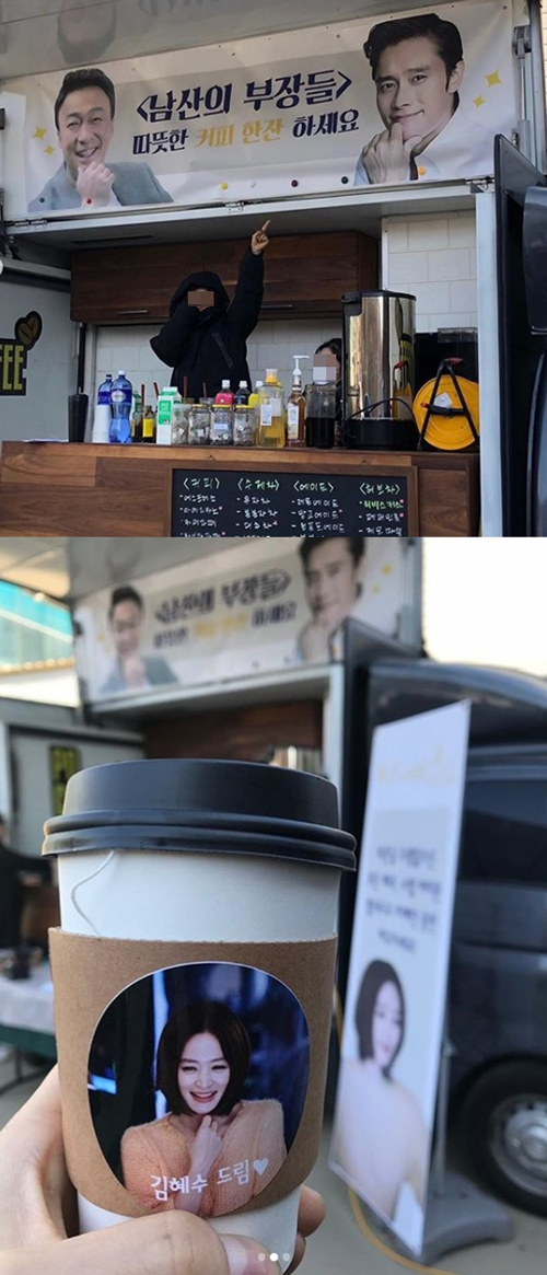 공개된 사진은 김혜수가 이병헌이 촬영 중인 영화 '남산의 부장들' 제작 현장에 보낸 커피차의 모습. "'남산의 부장들' 따뜻한 커피 한잔 하세요"라는 글귀가 눈길을 사로잡았다. 김혜수는 컵 홀더에 자신의 사진과 함께 "김혜수 드림"이라는 글을 담아 다시금 정성을 표현했다.