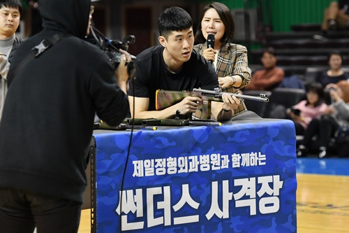 먼저 경기 시작전 2층 입구에서는 ‘썬더스 사격장’이 운영됐다. 사격 이벤트는 운동 전후에 바르는 관절크림 ‘닥터신 히트쿨’을 저격하면 해당 상품을 획득할 수 있도록 진행됐다. 또한 입장시 경기장 관객 전원에게 전투식량 건빵이 제공됐다.