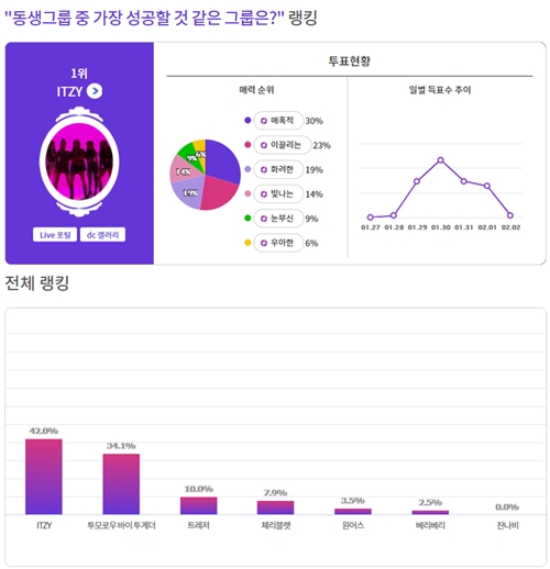 커뮤니티 포털사이트 디시인사이드와 취향 검색 기업 마이셀럽스가 운영 중인 '익사이팅디시'가 '동생그룹 중 가장 성공할 것 같은 그룹은?'으로 투표를 실시한 결과 ITZY가 1위에 올랐다. 이 투표는 지난 1월 27일부터 2월 2일까지 총 7일간 진행했다.