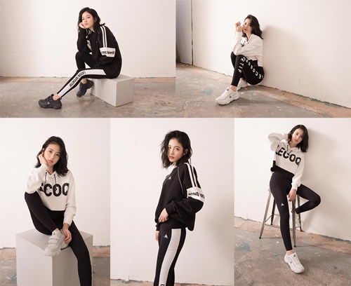 신예은은 특유의 에너지 넘치는 분위기로 우먼스 스튜디오 라인 레깅스와 함께 출시된 블랙 앤 화이트 컬러 블록 맨투맨, 2WAY로 활용가능 한 어글리 슈즈 모나코로 스타일링 해 여성스러움과 건강미가 돋보이는 애슬레저룩을 완성했다.