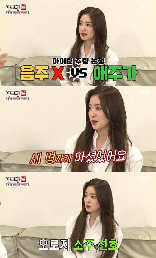 이날 강호동은 "아이린이 미녀들만 찍는 소주 광고를 찍었는데 진짜 주량이 궁금하다"고 언급했다. 이에 아이린은 "예전에 한창 마실 때는 소주 3병까지 마셨다. 마시다보니 술이 늘어서 그렇게 되더라"라면서 "요즘에는 그렇게 못 마신다"고 고백했다.