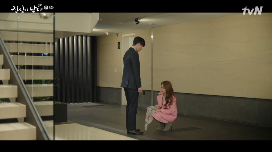 이날 아침 권정록(이동욱 분)은 오진심(유인나 분)에게 "클라이언트와 회의 때문에 한시간 늦게 출근합니다"라고 메시지를 보냈다. 오진심은 "날도 추운데 따뜻하게 입으세요"라고 답장을 보냈다. "너무 오버했나"라고 생각하던 중 권정록에게 "오진심 씨도 따뜻하게 입으세요"라고 메시지가 왔다. 이에 오진심은 "그렇게 따뜻하게 입으라 하니 입어야지. 역시 핑크가 좋아"라며 기뻐했다.