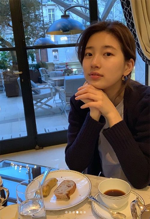 공개된 사진에서 수지는 파리 길거리의 벤치에 앉아 내추럴한 매력을 자랑했다. 메이크업 없이도 깨끗한 피부결이 돋보였다.