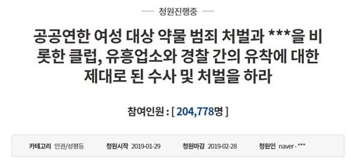 국민 20만명 이상이 버닝썬과 관련한 일련의 사건에 조사의 필요성을 느낀 가운데 정부가 어떤 조치로 국민에게 답할지 주목된다.