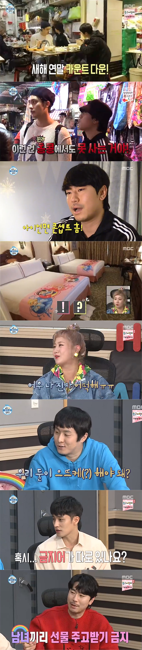 이어 기안84, 이시언, 성훈의 홍콩 여행이 공개됐다. 기안84는 갑자기 물욕을 폭발, 야시장을 누비며 폭풍 쇼핑을 했다. 기안84는 "한국에서는 마감하느라 쇼핑할 시간이 없었다"라며 "온 김에 쇼핑을 좀 하고 싶었다"고 이유를 설명했다. 기안84는 네팔풍의 가방, 옷 등이 있는 가게에서 폭풍 소비를 했다. VCR을 함께 보던 박나래는 "나도 저런 가방 좋아하는데 왜 내 껀 안 사왔냐"고 서운해했다. 이어 "다음주에 메고 와서 저 주세요"라고 말했다. 이를 들은 이시언은 "안 된다. 남녀끼리 물건 주고받지 말아라. 사내연애 금지다"고 말해 웃음을 안겼다.