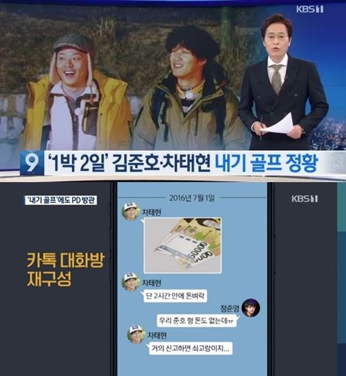16일 오후 방송된 KBS1 '9시 뉴스'에서는 가수 정준영, 차태현, 김준호 등이 속한 KBS2 예능 프로그램 '1박 2일' 멤버들의 카카오톡 단체 채팅방 내용에 관해 보도했다.