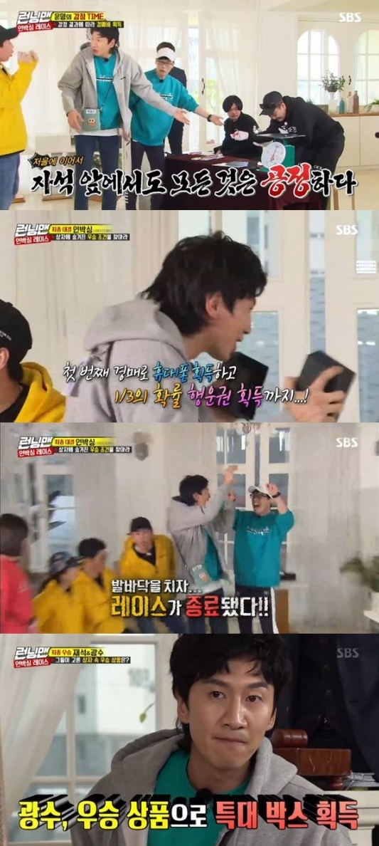 이어 행운권을 가지고 있는 상자를 뽑아야 하는 시간이 왔다. 이광수와 유재석은 행운권이 들어있는 상자를 뽑았다. 두 사람은 낙찰가의 2배를 획득했다. 그때 유재석, 이광수는 지령을 보고 조건을 확인하고 최종 레이스에서 우승했다.