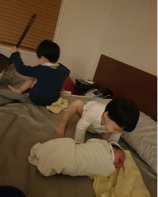 사진 속에는 정주리의 만삭 사진과 함께 세 아들의 모습이 담겨있다. 형이 된 두 아들은 막내 동생을 바라보고 있다.