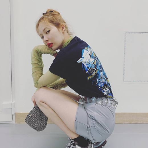 사진 속 현아는 하의는 미니스커트를 입고 시스루 블라우스와 티셔츠를 믹스 매치한 상의를 입은 채 스타일리시함을 뽐냈다.