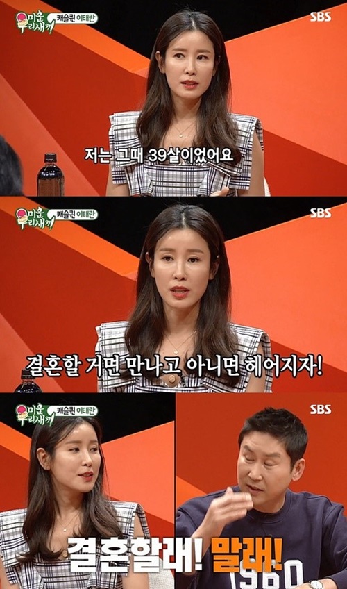 이태란은 이날 결혼 비화를 공개했다. "결혼 6년차"라고 밝힌 이태란은 "(결혼한 게)39세 였다. 마흔을 넘기기 싫었다. '결혼할 거면 만나고 아니면 헤어지자. 나는 시간이 별로 없다'고 질렀다. 생각할 시간을 며칠 줬더니 연락이 오더라. 결혼을 전제로 만나자고 하더라"고 설명했다.