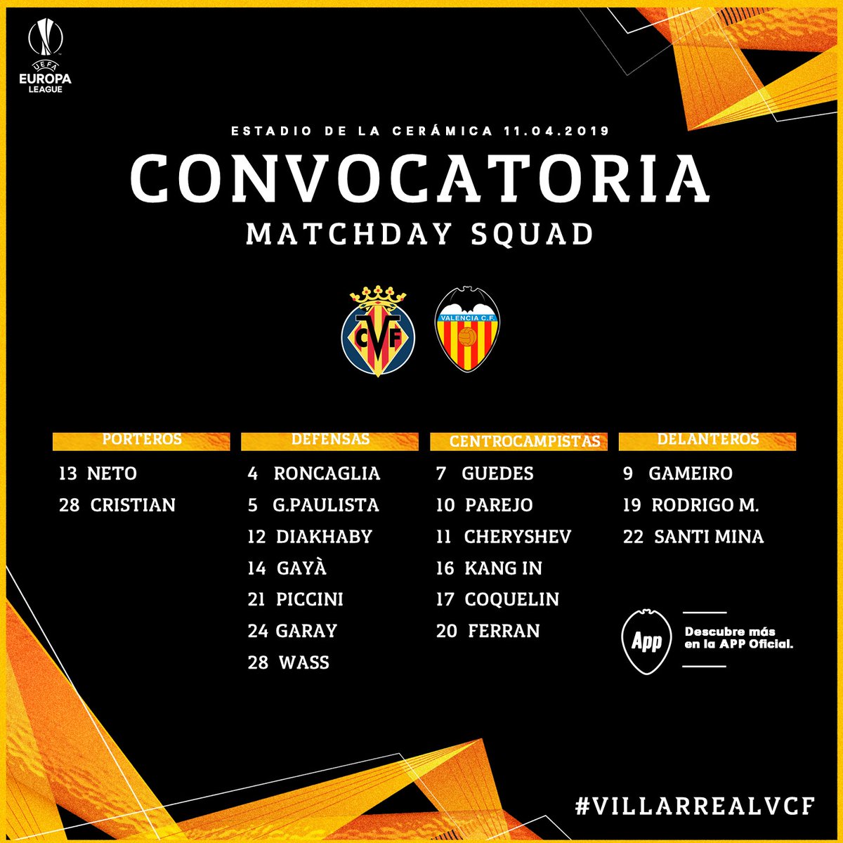 발렌시아는 11일(한국시간) 오는 12일 스페인 비야레알의 엘 마드리갈 경기장에서 열리는 비야레알과의 2018~2019 유럽축구연맹(UEFA) 유로파리그(UEL) 8강 원정 경기에 나설 18명의 선수 명단을 발표했다.