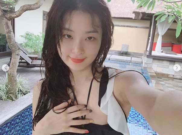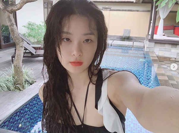 공개된 사진 속 슬기는 수영복을 입고 카메라를 응시하고 있다. 새하얀 피부와 앵두 같은 입술이 눈길을 사로잡는다.