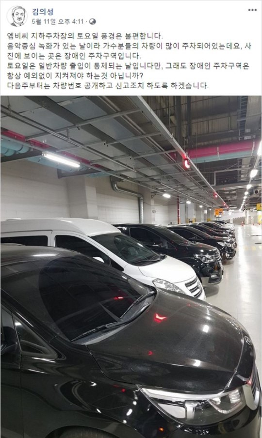 그는 "'음악중심' 녹화가 있는 날이라 가수분들의 차량이 많이 주차되어 있는데, 사진에 보이는 곳은 장애인 주차구역"이라고 지적했다.