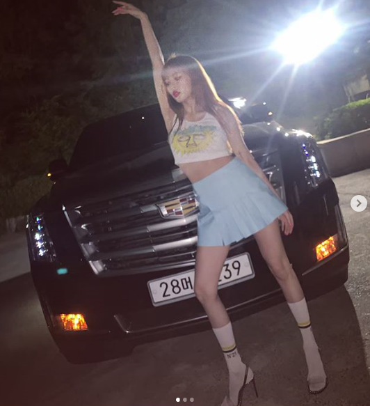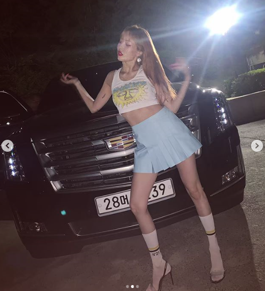 공개된 사진 속 현아는 하얀 민소매 크롭톱에 하늘색 미니 플레어스커트를 입고 포즈를 취하고 있다. 새하얀 피부와 완벽한 보디라인이 시선을 끈다.