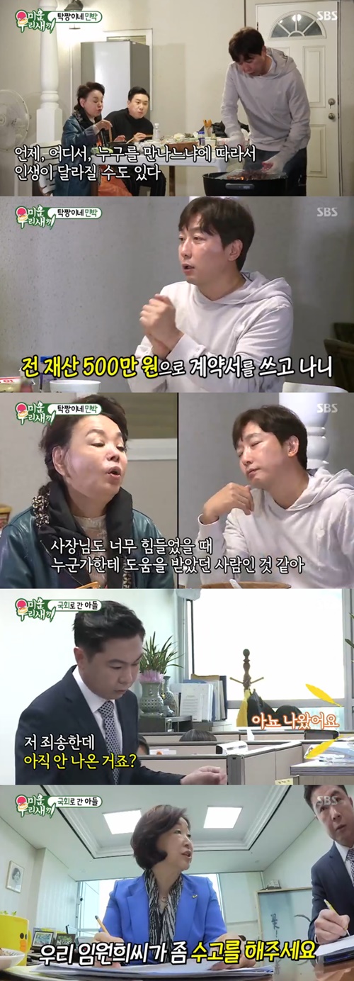 이어 탁재훈은 "그리고 3년 반이 흘렀는데 한 번도 잔금 달라는 얘기를 안 하시더라. 나중에 알았는데 은행 이자를 사장님이 혼자 내고 계셨다"고 밝혔다. 김수미는 "보통 인연이 아니다. 그 분도 옛날에 누군가에게 도움을 받았고, 그걸 너한테 갚는거다"고 답했다.