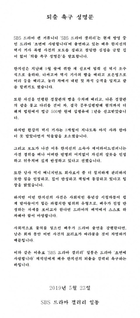이어 "배우가 진정 반성하는 자세를 보이고자 한다면 드라마의 배역에서 스스로 하차해야 함이 마땅하다. 사회적으로 물의를 일으킨 배우가 드라마 출연을 강행한다면, 남은 회차 동안 이번 사건의 꼬리표가 따라붙을 것이 자명하기 때문이다"고 말했다. 그러면서 "'초면에 사랑합니다' 제작진에게 한지선의 퇴출을 강력히 촉구한다"고 덧붙였다.