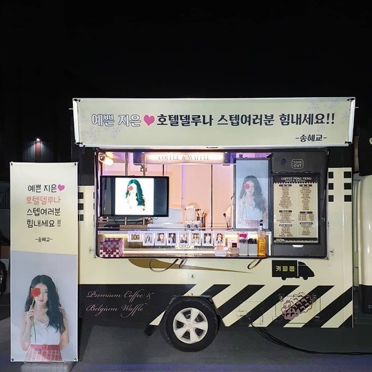 공개된 사진 속에는 "예쁜 지은, '호텔 델루나' 스태프 여러분 힘내세요"라는 플래카드가 걸린 커피차와 간식차의 모습이 담겨있다. 또, 업체는 "오늘 아이유 서포트는 항상 주변분들을 아끼는 천사 송혜교가 늦은밤 고생하는 이지은과 스태프, 배우들을 위해 커피와 음료부터 팥빙수, 슬러쉬까지 무제한으로 준비했다"며 "맛있는 분식 세트까지 든든하게 준비해뒀다"고 전했다.