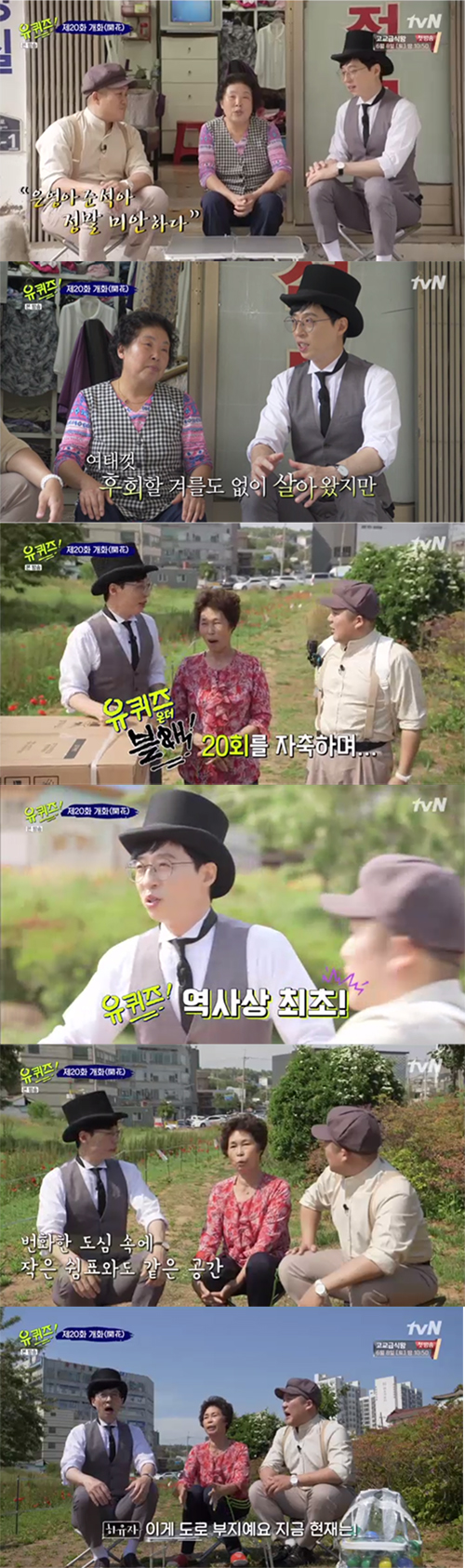 집 옆 아름다운 꽃들이 즐비한 곳을 찾은 유재석과 조세호는 그곳에서 한 할머니를 만났다. 지역 주민들과 함께 화단을 가꾸고 있다는 그는 유퀴즈에 응했다. 욕심이 없고 순수한 모습으로 흐뭇함을 자아냈던 할머니는 안타깝게 퀴즈 문제를 맞추지 못했지만 '자기백'을 통해 대형 건조기를 획득했다.