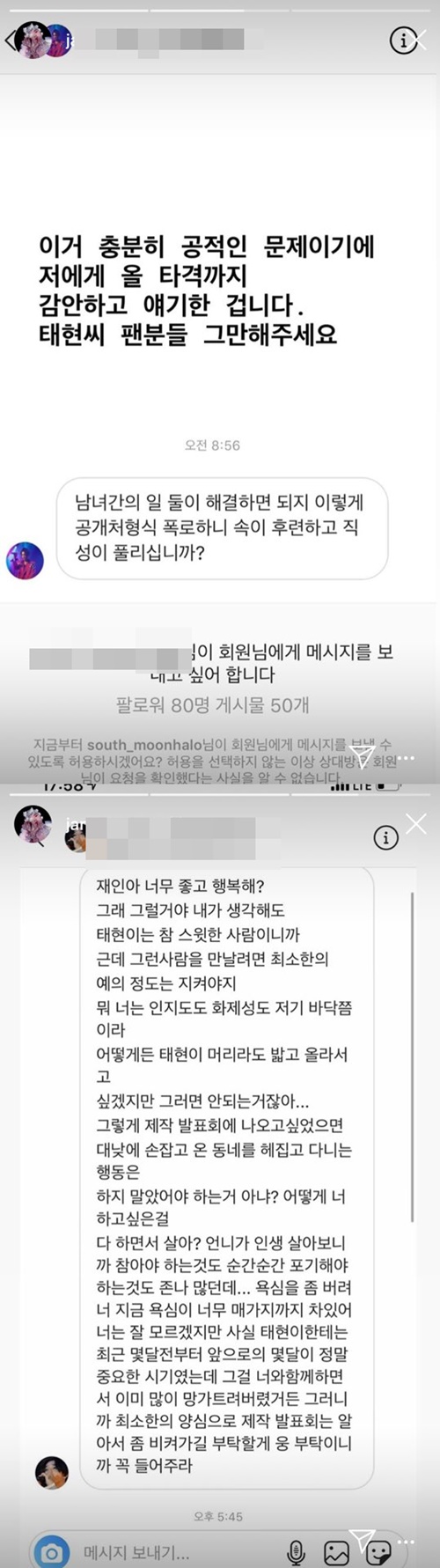 이어 이 네티즌은 "태현이한테는 최근 몇달 전부터 앞으로가 정말 중요한 시기였는데 너와 함께하며 이미 많이 망가졌다. 알아서 비켜가달라"고 날선 내용의 부탁을 함께 전했다.