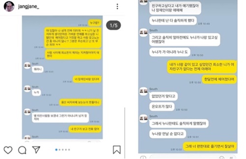 또한 A 씨가 "너 장재인 씨랑 있다며. 용산 영화관에 보는 눈이 한둘이니. 내 친구가 보고 전화 왔어"라고 말하자, 남성은 "별 미친 사람들 다보겠네. 그런 거 아니니까 넘겨짚지 마"라고 반응했다.