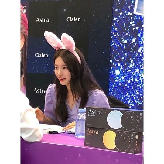 공개된 사진 속 수지는 한 코스메틱 브랜드의 팬사인회에 참석한 모습이다. 수지는 핑크 컬러의 토끼 머리띠를 하고 귀여운 매력을 드러냈다.