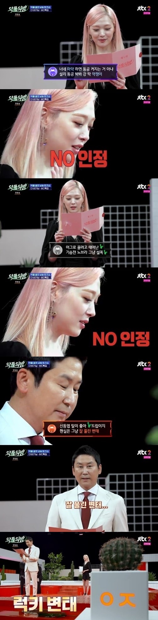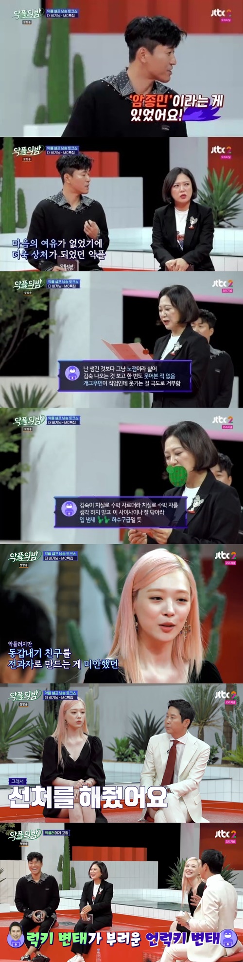 21일 첫 방송 된 JTBC2 예능프로그램 '악플의 밤'에서는 MC 신동엽, 김숙, 김종민, 설리가 악플에 대한 다양한 생각을 밝혔다.